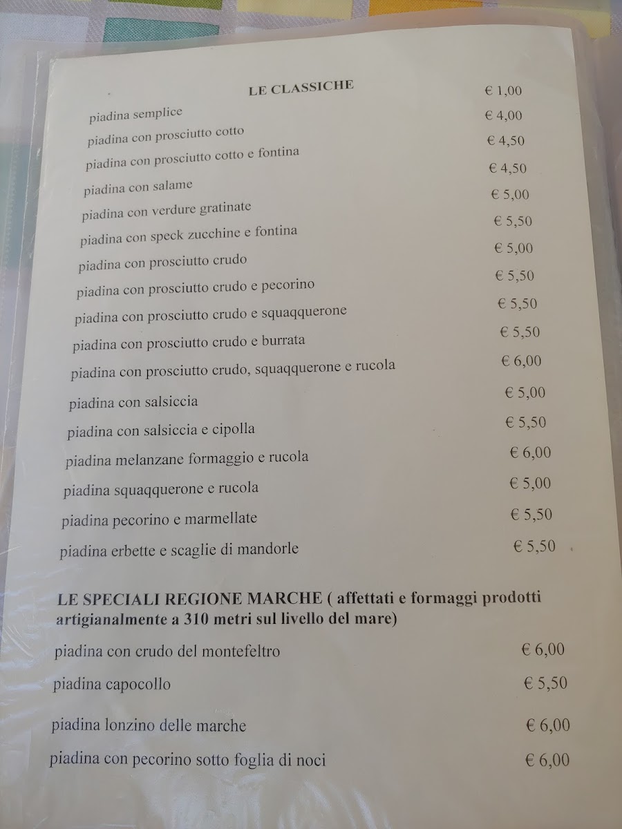 The menu at Piadina E Collina offers a delightful mix of traditional Italian flavors, perfect for anyone looking to enjoy authentic cuisine in the heart of Santarcangelo di Romagna. One of the standout items is the Piadina, a simple yet delicious flatbread filled with a variety of savory ingredients. This dish is a classic of the Emilia-Romagna region, and here it is served fresh, with different fillings that cater to all tastes. For those wanting a taste of the local flavors, the Affettati Romagnoli Buonissimo is another must-try. It features an assortment of cured meats from the Romagna region, offering a rich, savory experience that perfectly complements the lightness of the Piadina. Both dishes reflect the essence of regional Italian dining, providing a satisfying and authentic meal at reasonable prices. Whether you're enjoying a quick bite or a leisurely meal, the simplicity and quality of these dishes make Piadina E Collina a go-to spot for food lovers.